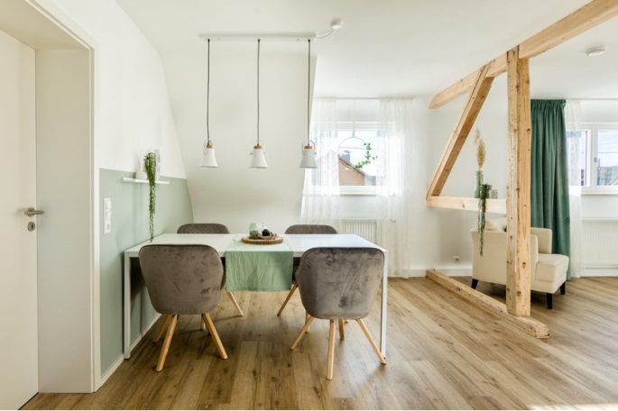 Besonderes Augenmerk lag auf dem Erhalt und der Sichtbarmachung vorhandener Elemente: Die freigelegten Holzbalken verleihen den Räumen nicht nur Charakter, sondern erzählen auch die Geschichte des Hauses. Durch die Verwendung natürlicher Materialien und harmonischer, erdiger Farbtöne entstand ein ruhiges, authentisches Wohngefühl.