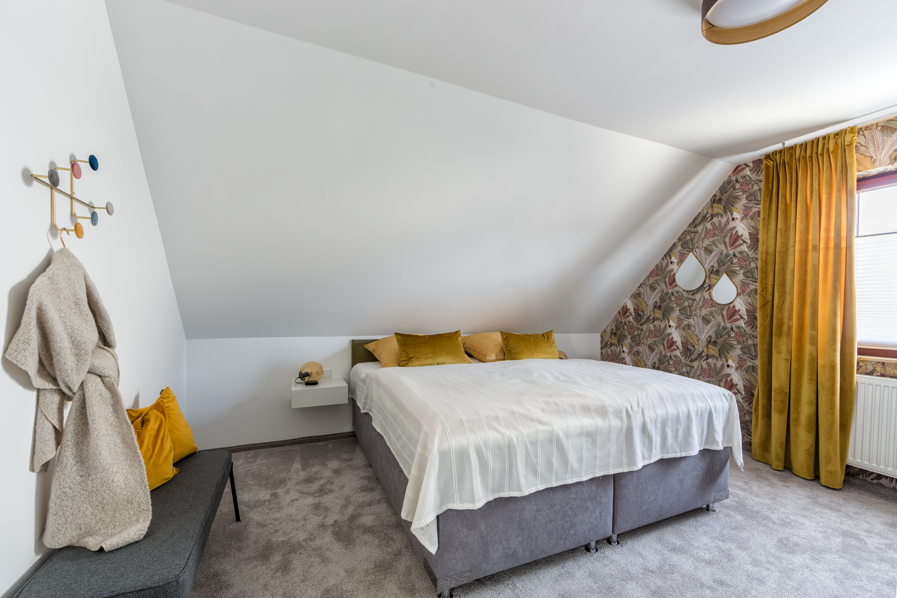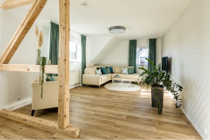 Besonderes Augenmerk lag auf dem Erhalt und der Sichtbarmachung vorhandener Elemente: Die freigelegten Holzbalken verleihen den Räumen nicht nur Charakter, sondern erzählen auch die Geschichte des Hauses. Durch die Verwendung natürlicher Materialien und harmonischer, erdiger Farbtöne entstand ein ruhiges, authentisches Wohngefühl.